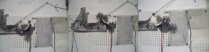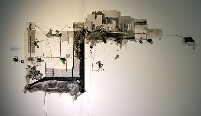 Medium: Wall Installation, mixed media: prints: drypoints and monotypes, cotton waste, physical computing components: arduino uno board, servo motors, DC motors, potentiometer, LED lights, stopframe animation, found objects, thread, gauze and shade cloth.