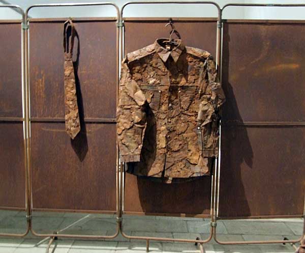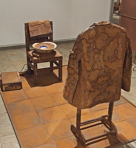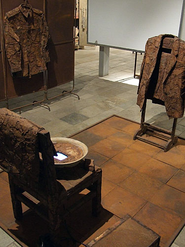 Over a clothes stand hang a man’s jacket and a pair of trousers. A chair and a screen is placed next to the clothes stand. On the chair is a basin, towel and soap and against the screen hang a man’s shirt on a coat hanger and a tie. Everything is made out of rusted metal. In the basin is a small TV monitor with the image of a razor continuously being rinsed in water.