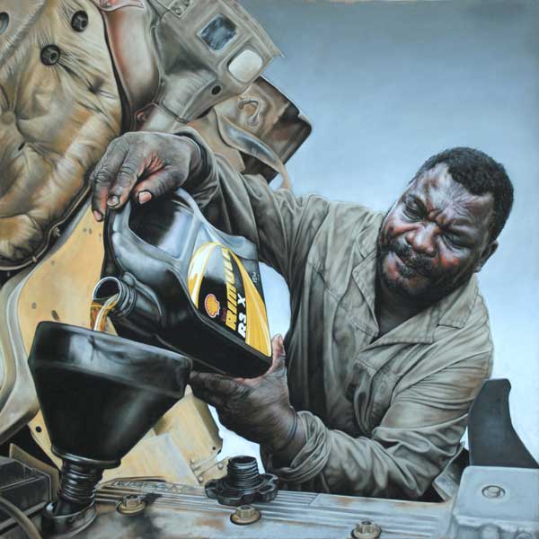 Her approach (specifically in the pastel drawings) transcends conventional notions of realistic portraiture, rendering her work a unique quality. Her drawings capture the essence of these workers at work; exploring their relation to the work they are employed to do.