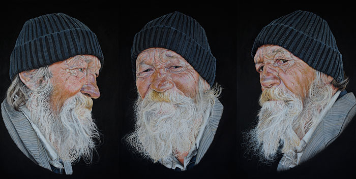 Most of the art works are intense studies of a variety of faces and expressions, giving almost no clue to environment or dress. Titles like “The hungry philosopher” or “The social non-conformist” classifies each portrait as a type.