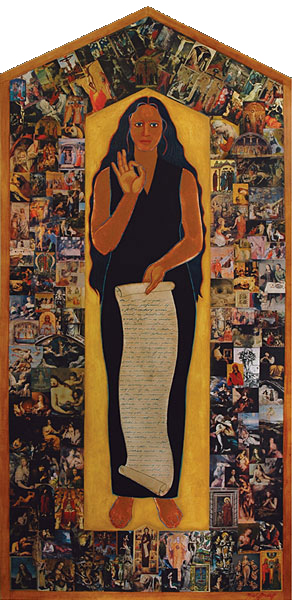 Oil and collage on shaped masonite