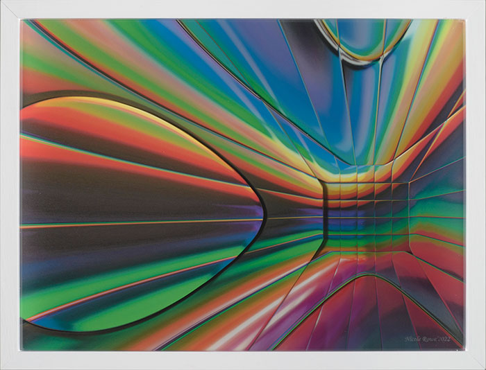 So, I have attempted to reflect on all that in my artwork and I have used my favourite medium of glass as a starting point. I then took a photograph of the light reflected off the back of a CD and manipulated that image using digital software on my cell phone. I printed the resulting image onto laminated vinyl which I selectively layered between five sheets of varying thicknesses of glass; all strategically held together using crystal clear glue.