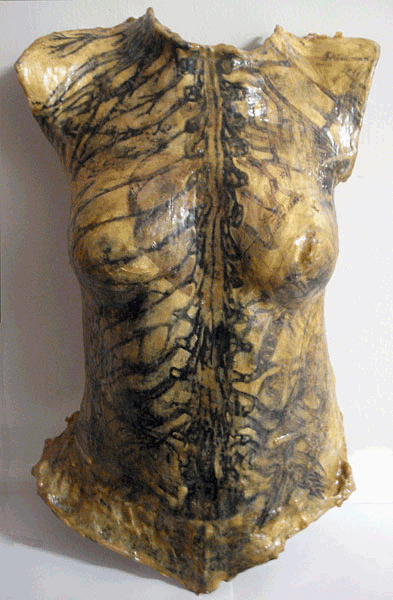 Curated by Paul Boulitreau, wearable art started with a fashion show in which the art works were modeled at UJ and then exhibited at Aardklop. The work made for this exhibition consisted of a life size plaster of paris bodycast and photographs of me holding the cast. The origin of this work arose from the idea that “Our skin is our gut, our gut is our skin”. As the cells in the miniscule human embryo unfold and entwine in new patterns and maps of infinitismally complex kinds, the skin establishes itself as the great organ of consciousness. It waits to receive the impressions of the air, the sounds of creation, to give back the expressions and gestures of another. The narrative of our existence is not only pressed and scratched, moulded into the skin, but it gives the very elements of the narrative which our consciousness longs for. Each wisp and wave of the web of consciousness is singing to the touch of its beautiful lover, the skin.