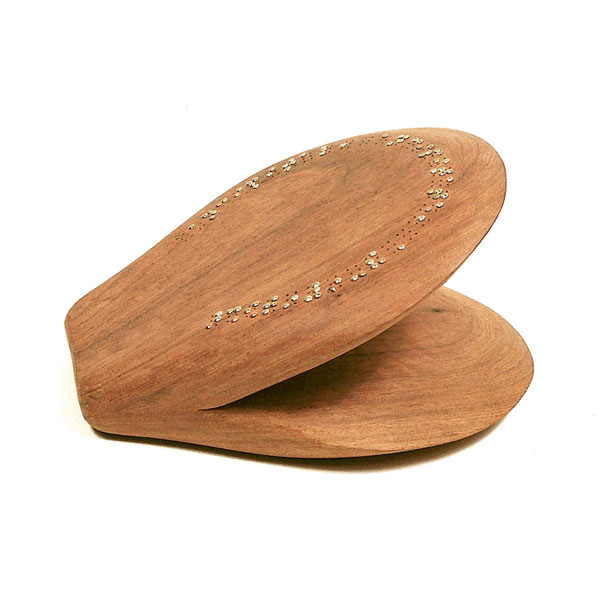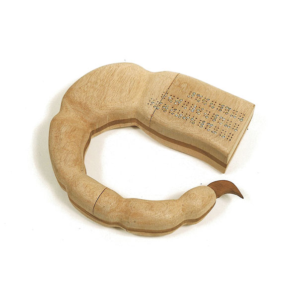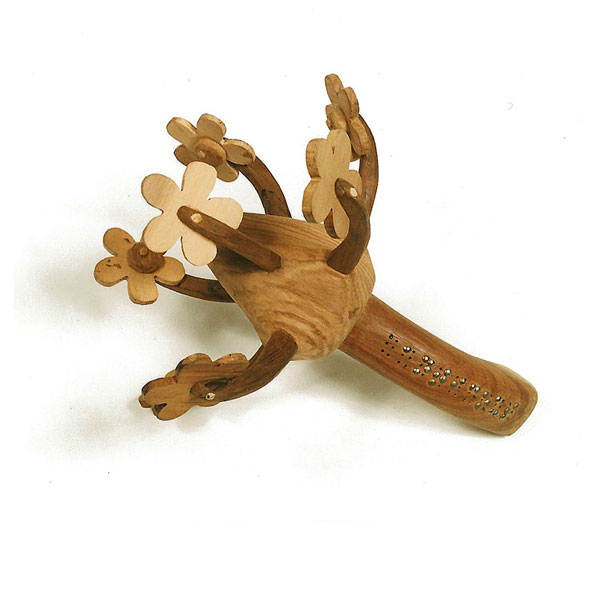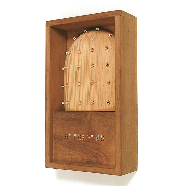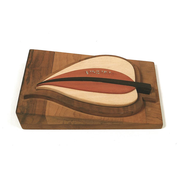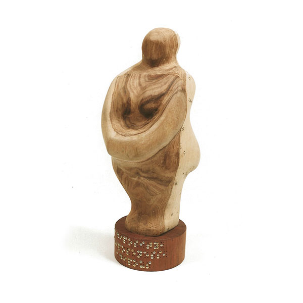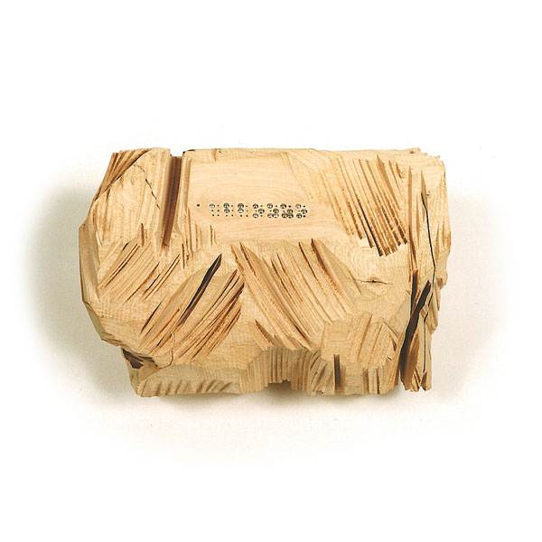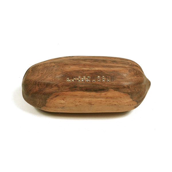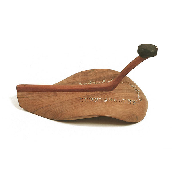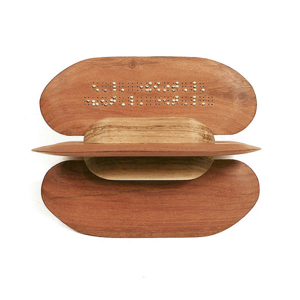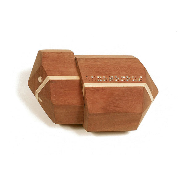 The sculptures are hidden from clear view by being placed in boxes, where gallery rules prevent them from being opened by the sighted. When blind people visit art galleries they are usually guided to find sculptures, and to see that they don't damage anything. The units of the Blind Alphabet are so conveniently close together that the blind are not lost. Each piece is of a manageable size and height, near at hand, so that it can be picked up and fondled close to the body, over a basket, where it won't fall to the ground. BLIND ALPHABET ABC has been extensively exhibited, and even though the blind have actively indulged in it, they have yet to cause any damage.