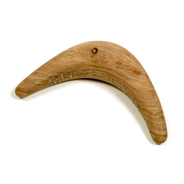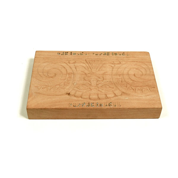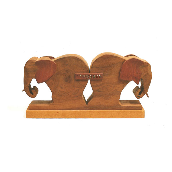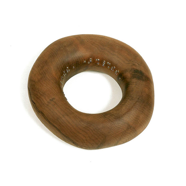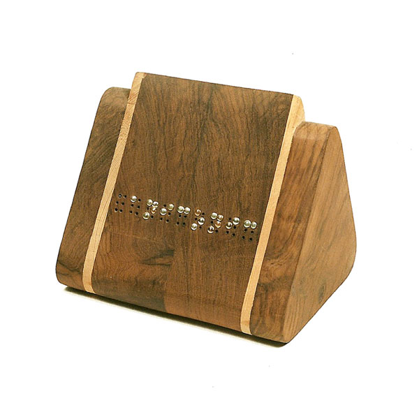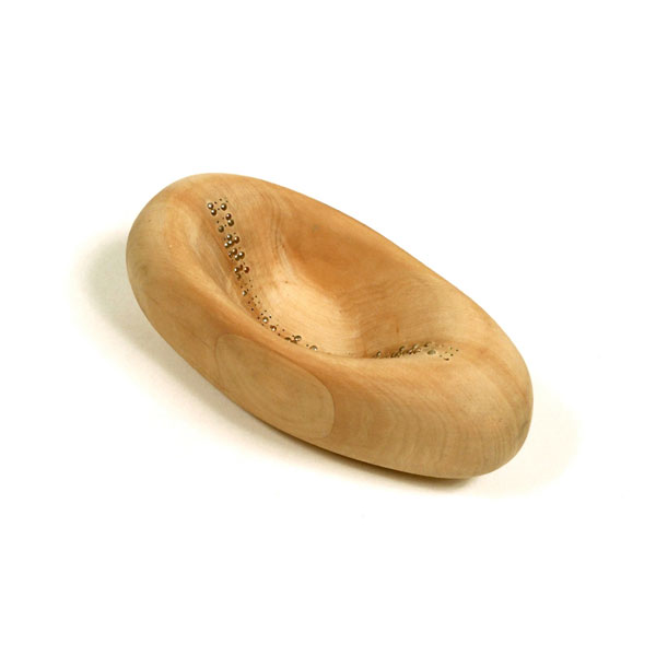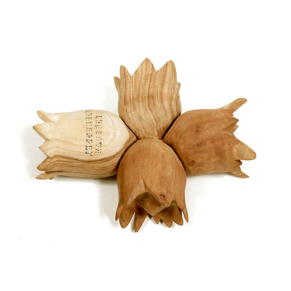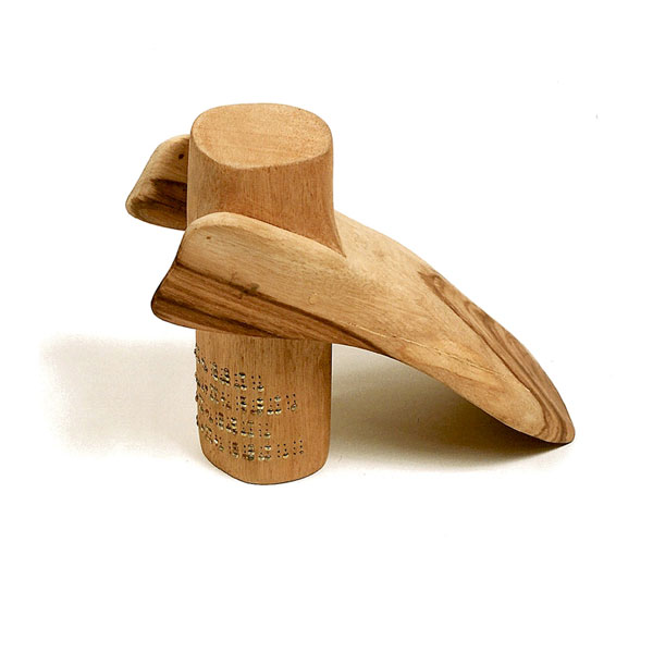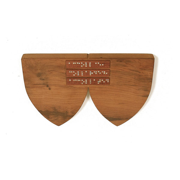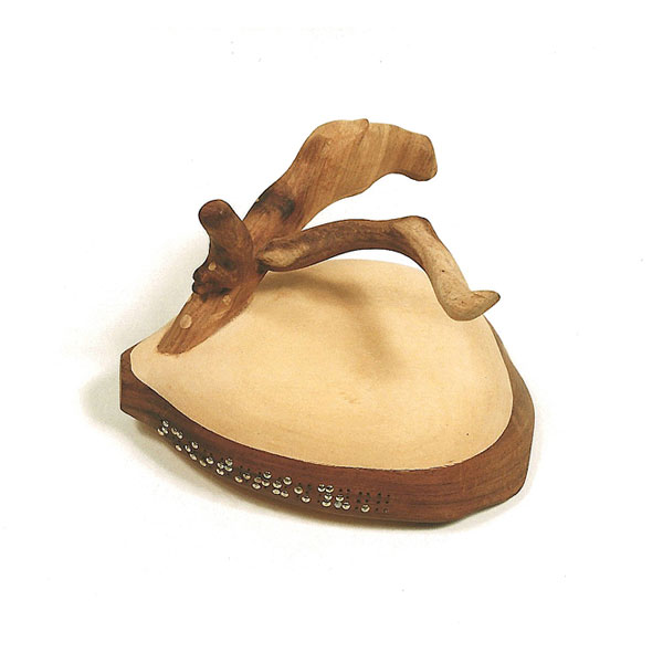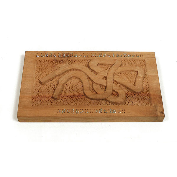 The sculptures are hidden from clear view by being placed in boxes, where gallery rules prevent them from being opened by the sighted. When blind people visit art galleries they are usually guided to find sculptures, and to see that they don't damage anything. The units of the Blind Alphabet are so conveniently close together that the blind are not lost. Each piece is of a manageable size and height, near at hand, so that it can be picked up and fondled close to the body, over a basket, where it won't fall to the ground. BLIND ALPHABET ABC has been extensively exhibited, and even though the blind have actively indulged in it, they have yet to cause any damage.