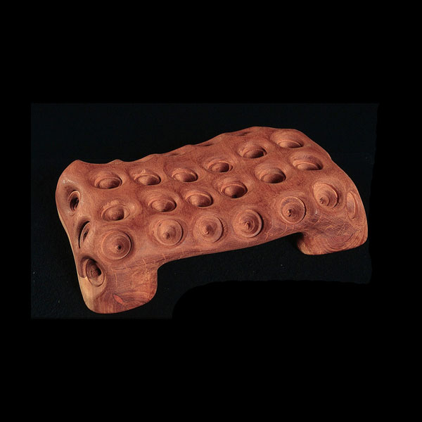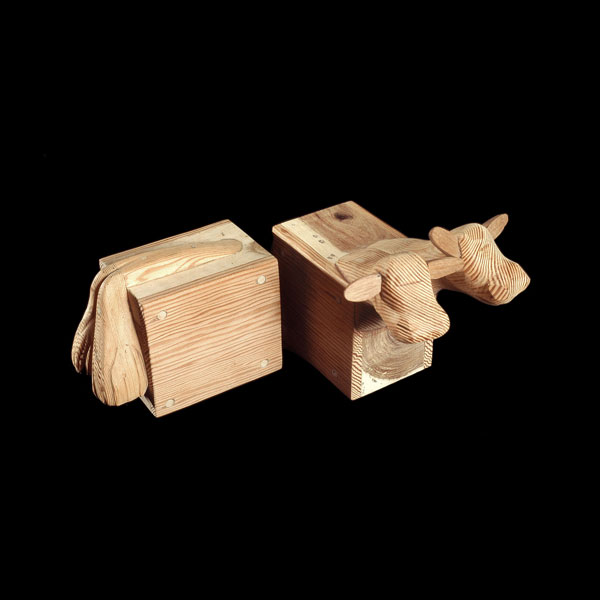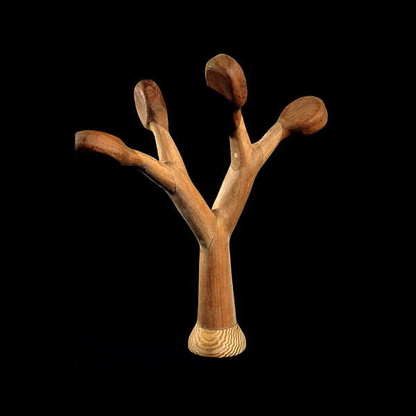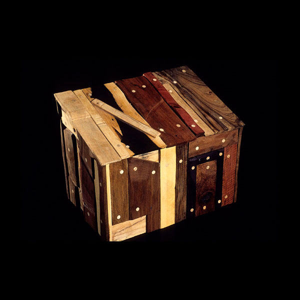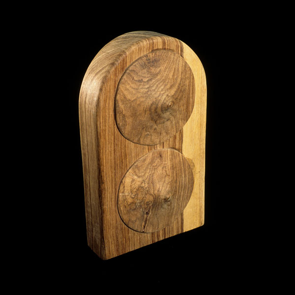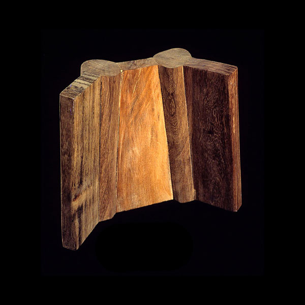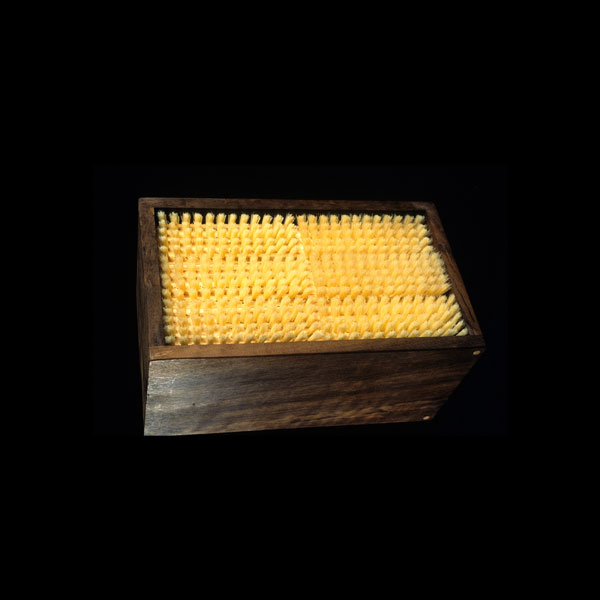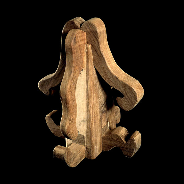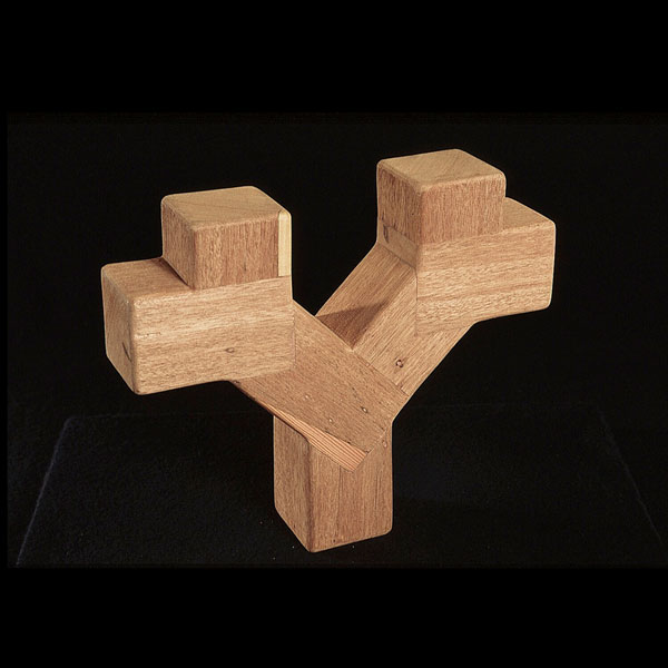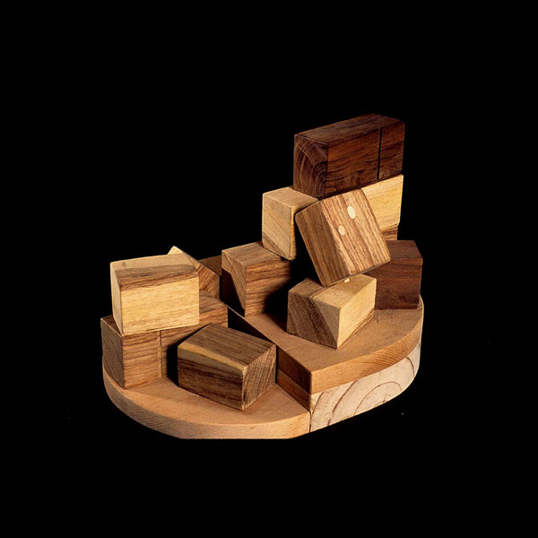 The sculptures are hidden from clear view by being placed in boxes, where gallery rules prevent them from being opened by the sighted. When blind people visit art galleries they are usually guided to find sculptures, and to see that they don't damage anything. The units of the Blind Alphabet are so conveniently close together that the blind are not lost. Each piece is of a manageable size and height, near at hand, so that it can be picked up and fondled close to the body, over a basket, where it won't fall to the ground. BLIND ALPHABET ABC has been extensively exhibited, and even though the blind have actively indulged in it, they have yet to cause any damage.