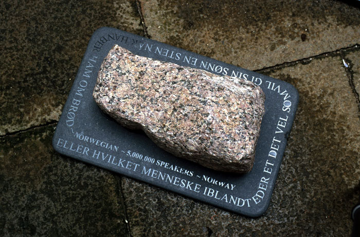 The pacifist resists and subverts with critique by way of subverted language. Critique of power relations is the armature of the notion of a humane society. A humane society is not possible unless human beings become aware of the absurdities of one-sided attempts to civilize, to refine or to polish, thereby sacrificing diversity for sameness. Boshoff dramatises, so to speak, this view on history in his Panifice. The work derives from a text in the Gospel according to Matthew. 7:9: "Or what man is there of you, whom if his son ask for bread, will give him a stone?" Panifice is a collection of pairs of bread on breadboards, each pair consisting of one brad on a breadboard inscribed with the verse from the Matthew gospel in an extant European language, and a bread on a breadboard inscribed with the same verse in an African, sometimes extinct language. The breadboards with their engraved texts, of black granite, are reminiscent of gravestones. One has to stoop to read the words. A searing interplay of meanings is the result. The issue of the meaning of intercultural contact is raised: was the bread of European culture that was distributed in Africa wholesome or deadly? What is shared by Europe and Africa? Memories of extinction, such as the culture of the San people who were hunted down like animals? Or do Africa and Europe make company, that is come together (Latin: cum) for bread (Latin: panis)? In the final analysis Panifice reflects on the nature of the concreteness of sharing meaning. Is meaning encountered in the humane gesture of reaching out to the other in their otherness, enriching the self by the experience of the other, or is meaning dictated by casting the self in stone and exporting it to distant consumers presumably in need of a self like the one and only self?