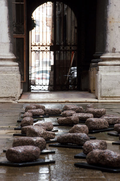 As was the case with Marcel Duchamp, art as an institution is unsettled by Willem Boshoff's work. Whereas Duchamp disenfranchised the work of art as masterpiece, Boshoff disenfranchises the art public as connoisseurs of the finest things in life. The kind of art public that the institution of art presupposes, viz. an art historically informed, educated and relatively well-to-do (enough to have leisure time and space available for itself) group of people, who, ironically, are the first to meet Boshoff's works, realises immediately that they are at a disadvantage. Encountering Boshoff's Blind Alphabet, the normally sighted art-going public finds itself dependent on those people for whom an art gallery is usually not accessible. The visually challenged part of the public, completely marginalized by the world of the art gallery, is called upon to disclose the meaning of the collection of objects. The same strategy is employed in Writing in the Sand and Circle of Knowledge. "Marginalized" or abstruse words in English, recognizable as part of the vocabulary of global English by the suffixes of -ology or-ism by any user of English are explained in indigenous (South African) languages. The effect of double alienation (marginalized English words, explained in a "foreign" language) is strengthened by the medium. Writing in the Sand is executed with silicone and grounded, oxidized ore - silicone conjuring the notion of the fleetingness of computer generated writing and of a shared meaning agreed and understood between two languages. Circle of Knowledge consists of eleven granite blocks on which a mini-dictionary of twenty of these unfamiliar -ology and -ism words are explained in the eleven official languages of South Africa. Although the indigenous languages of South Africa have the floor, even literally in the case of Writing in the Sand, and although they are engraved in stone in Circle of Knowledge, they remain unheard and unspoken, stumbling blocks for the international intellectual world traveller. In these works the artist "wish[es] to reverse the dominance and power of privileged tongues [and positions]" and to frustrate them. The artist explains: