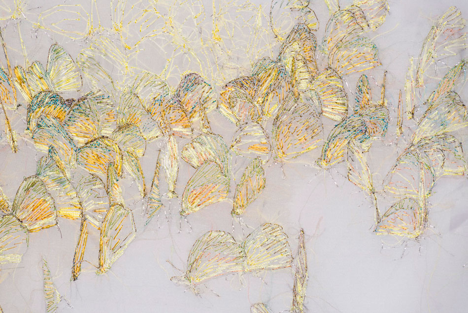 Hand embroidered with silk, viscose and recycled nylon threads on silk organza
