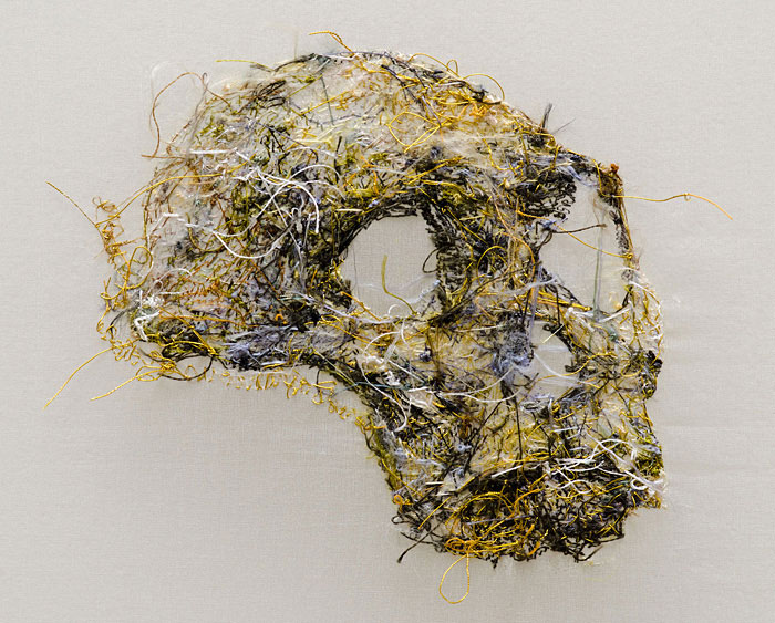 I have interpreted Australopithecus sediba in fine stitches with silken and metallic threads on a canvas of fragile silk chiffon. The hand embroidered stitches, fabric canvas with the creases and the perspex frame, together constitute human traces, and are symbolic of the genus Homo (humans) who were to follow.