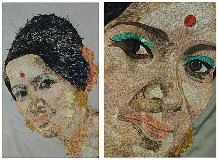 … I look at photographs during a time of turmoil. Then I wonder, more than ever, who am I and how I came to be here. The photograph empties me of agendas and worries and places me in a rare atmosphere of pure wonder. There it is that things happen, that life renews itself through a visit to the past. A photograph is a liminal space, neither real nor imaginary, a middle region where the soul comes to life. To the literal mind, a photograph may look like a record of the past, but to the poetic mind it is an uncanny presencing of self and world that is pure, deep and revealing. Over the years, the disease relentlessly made inroads across my mother and my psychic landscapes. She became home bound and entirely dependent on her family and caregivers for her well-being. We lost my brother, Bupendra, tragically in August 2006 and soon after, my mother stopped eating. We were informed that the loss of ability to eat and to swallow was also symptomatic of the disease. My mother was now to be fed through a nasal-gastro intestinal tube. She no longer recognised us, her children and grandchildren. I was encouraged to paint my story. In November 2006, I started painting portraits of my mother from the photographs she had given me. I started with the portrait of her carrying me. The paintings, done in a photorealist style, were an attempt to preserve and immortalize my mother in the face of her steady deterioration. Painting these portraits became an expression of my grieving. Over the years, I painstakingly put my mother back together with my painting and embroidery, initiating this series, ‘Evanescence’. Upon each visit to my mother, I was forced to come to terms with the reality that her condition was worsening. She no longer spoke. The disease had silenced her. Tentatively and furtively, I started photographing my mother, and then began painting her from these photos. I searched for glimpses of her. I painted her hands in preparation for my final portrayal of her. These hands had embraced me, nurtured me, comforted me and caressed me over three decades. They now seem resigned.