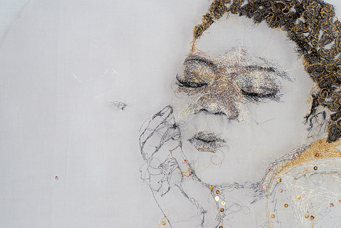 At its simplest level, Amita Makan's exhibition "Nomalungelo: Threads to Freedom" may be read as a series of eight embroidered portraits, book-ended chronologically by "Loose Ends" (2009), a portrait of the artist's deceased mother, and "My Black President" (2014), a portrait of deceased musical legend Brenda Fassie. Between these are a series of portraits of Miriam Makeba and Dorothy Masuku, two further goddesses of South African music, along with self-portraits of the artist. What holds together this seemingly disparate collection is: the subjects are all women; they are all brought to life using the threads and swatches of sari's belonging to the artist's mother; they are certainly all divas, and objects of worship; and they are all - in various sectors whether public or private, social or domestic, local or international - vocal and pioneering advocates of the right to freedom. View the full catalogue   ![]()