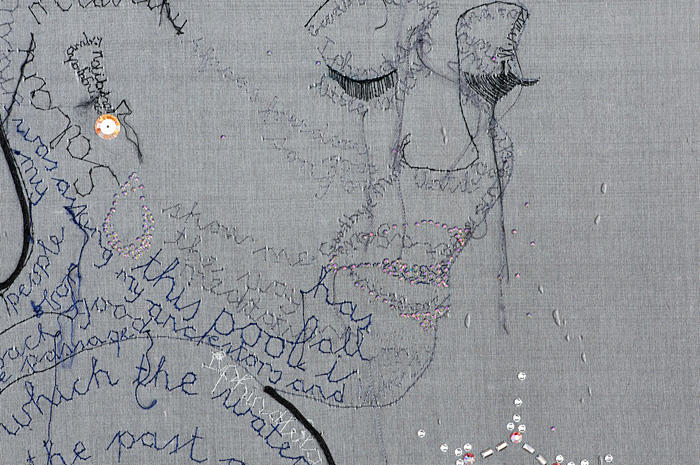 Embroidery wih silk and metallic thread on silk organza with Swarovski crystals, sequins and vintage saris