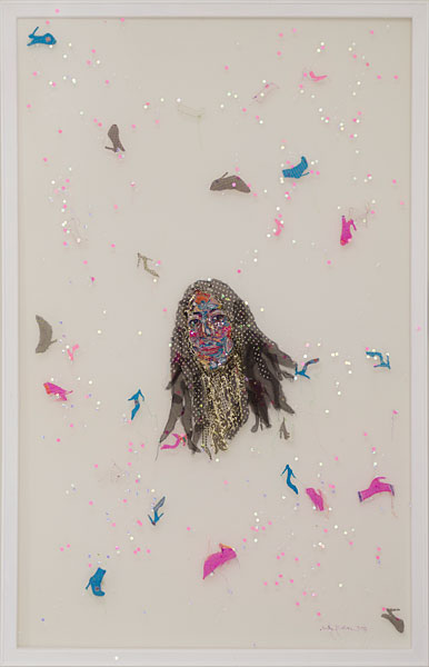 In the first work, ‘Self Portrait’, my face is pieced together from a mosaic of vintage saris with ancestral stitches to ‘pin down’ and capture my Self on the fragile tulle. A fragmented and multifaceted self with an Indian face emerges. I further pierce the ‘veil’ of my Indian identity to find the absolute. The ‘reverse’ is nuanced, somewhat abstract, and reflects an identity in flux, undergoing metamorphosis. I am surrounded by an array of appropriated western shoes, notably stilettos. These are a metaphor my ancestral and my own journey, and reflect notions of caste, gender, class, migration, modernity, globalization and freedom.