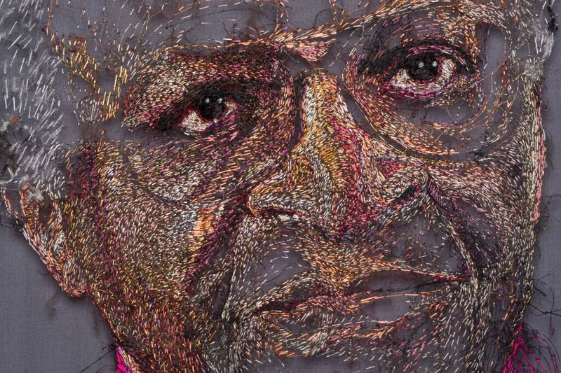 The hand-embroidered portrait is inspired by a photograph of Archbishop Emeritus Desmond Tutu taken at his residence in Bishopscourt, Cape Town in 1988 by Rashid Lombard.