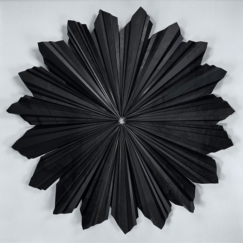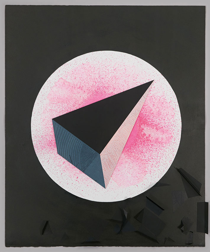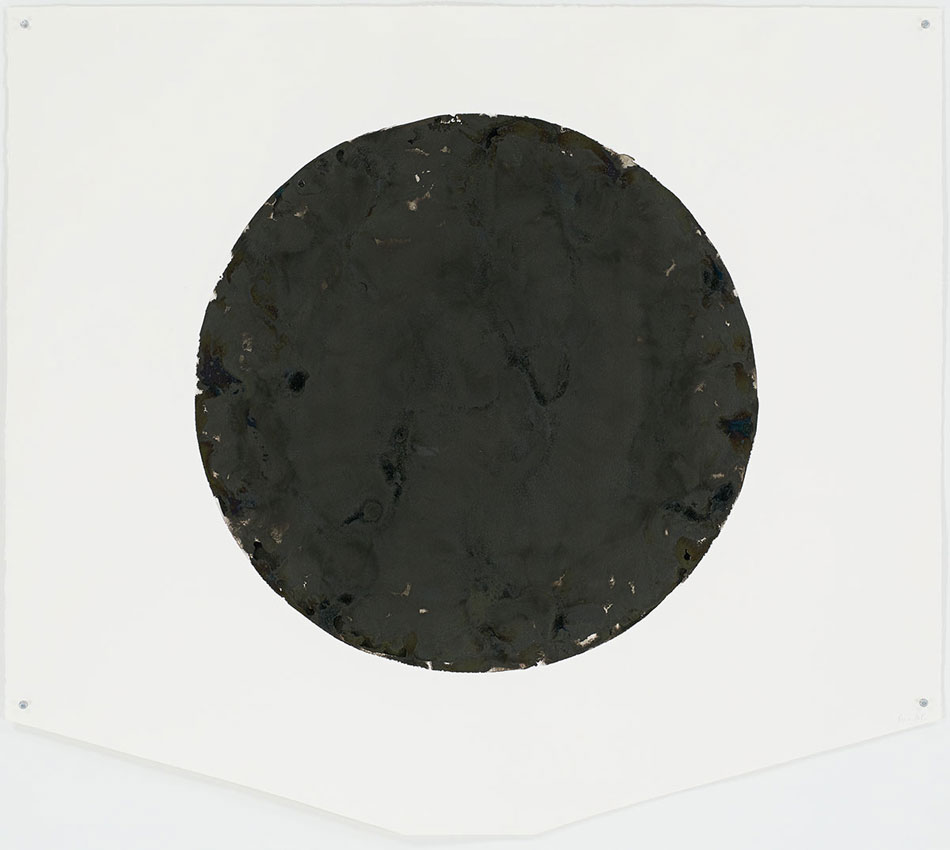 The aim of this exhibition is to explore the materiality of this medium by engaging with its limitations and thresholds by saturating, tearing, folding and erasing the paper’s surface. In contrast to these controlled manmade processes, I have allowed for an organic process to take place. Water is used as a carrier for pigments, incorporating its natural flow and evaporation to inform certain uncontrollable marks on the surface. Throughout this body of work, I have explored different tensions that have arisen. Firstly, the tension caused during the papers interaction with water, which causes it to warp and change shape. Secondly, an imposed structural tension that operates between the organic marks and the geometric forms, which sit on their surface. A recurring geometric form is the circle. The circle is a Jungian archetype for the psyche: a symbol of eternity, wholeness and unity. It has no beginning or end. When combined with a square (the body archetype), it highlights the relationship and balance between the psyche and the body. While the circle is eternal, the black circle alludes to the void, an absorber of light, a repressed shadow side. In Japanese philosophy the Void represents a connection to creative energy and spontaneity.