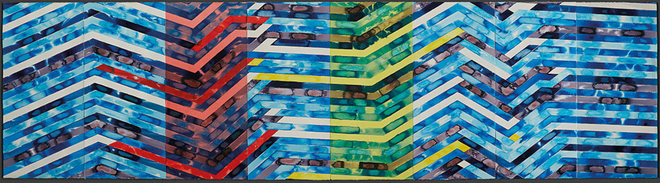 In previous work, I had engaged with notions of displacement and belonging through depictions of the body. By focusing on the skins’ surface as a boundary, it could be mapped, patterned and deconstructed. Currently, I am exploring the body as a concept of space, exploring both land and water as bodies in themselves. The deconstructed elements that previously mapped out the body’s surface, almost like topographic maps, now expand beyond it, to form extensive spatial platforms. This allows for a new freedom beyond the confines of prescriptive figurative representation.
