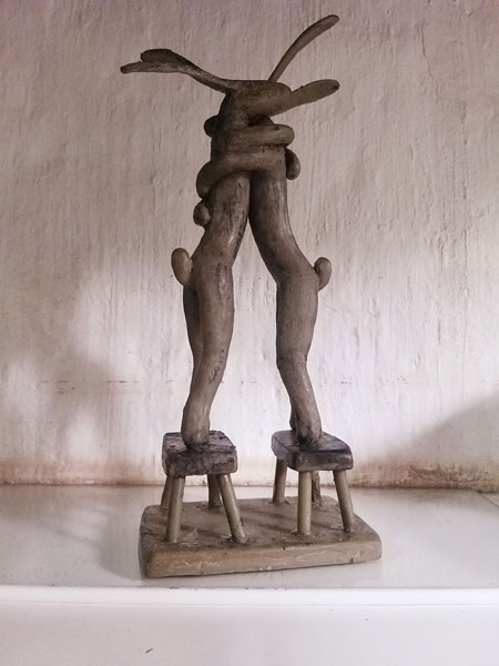 Artist:  Guy du Toit Title:  Hugging hares on chairs Medium: Bronze Size:  32 cm x 16 cm x 9 cm Price on Request Message of hope: It won`t be like this forever. The sun will rise again. The will be a rainbow after this storm.