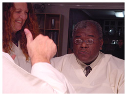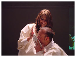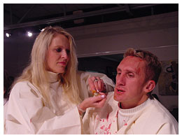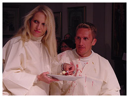 The men, namely Jacques du Preez (presenter, 'Geraas'), Henja Schaap (fashion editor, De Kat), Gerhard Greyvensteyn (researcher, 'Geraas'), Thomas Thomson (fashion designer), Simon Rademan (fashion designer dressing Miss South Africa), Prof Jonathan Jansen (Dean, Faculty of Education, UP), Thabo Leshilo (Editor, Pretoria News), Freek Swart (retired political editor of Rapport), and Henning Pieterse (writer, Hertzog Prize Winner, 2001) were fed by Helena Hettema (singer and songwriter), Patricia Glyn (presenter, SAfm), Esmeralda Bihl (presenter, 'Geraas'), Jennifer Ferguson (singer and songwriter), Sandra Prinsloo (actress), Ronel Nel (Organiser: Aardklop), Arina de Witt (singer), Lucia Burger (journalist), and Vanessa Carreira (Miss South Africa). During this ten-course dinner, the men became bloated and nauseated by the excess, while the women longed for a morsel of the opulence. Even the audience present, had nothing other than wine and dry cheese sticks