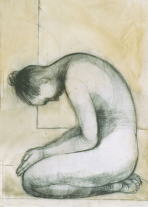 Artist:  Majak Bredell Title:  study for SACRED MIRROR. 1996 (108.5 x 77cm) framed Medium: gesso, graphite & oilwash on Stonehenge paper Price on Request