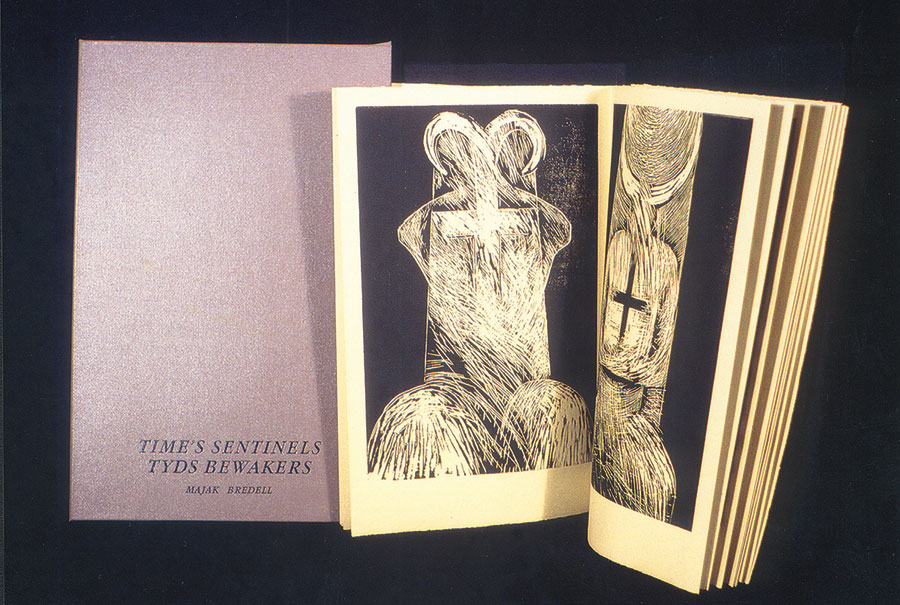 Artist:  Majak Bredell Title:  TIME`S SENTINELS. 1996 (page size 48 x 31cm) edition 10 Medium: accordion-fold artist book with woodcuts and poem on Nideggan paper Price on Request