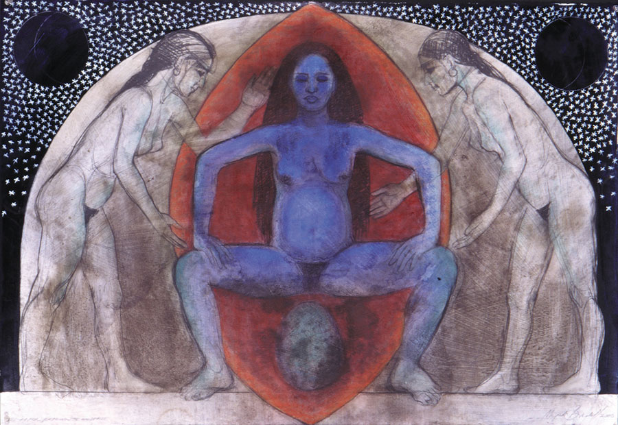 Artist:  Majak Bredell Title:  BIRTHING THE UNIVERSE. 1999 (77 x 112cm) framed Medium: gesso, graphite, pastel & oilwash on Stonehenge paper Price on Request