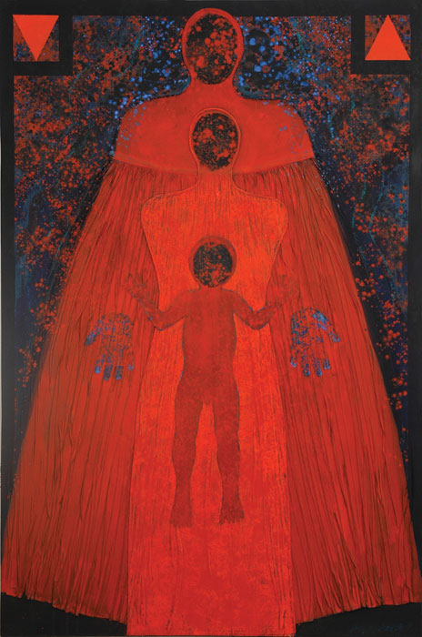 Artist:  Majak Bredell Title:  BLACK MADONNA - GODDESS OF BEGINNINGS. 2009 (180 x 120cm) Medium: fabric & oil on masonite panel Price on Request