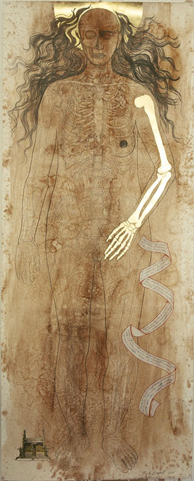 Artist:  Majak Bredell Title:  MAGDALENE - BODY & BONES. 2016 (170 x 68cm) Medium: gesso, graphite, oilwash & goldleaf on Lenox paper Price on Request