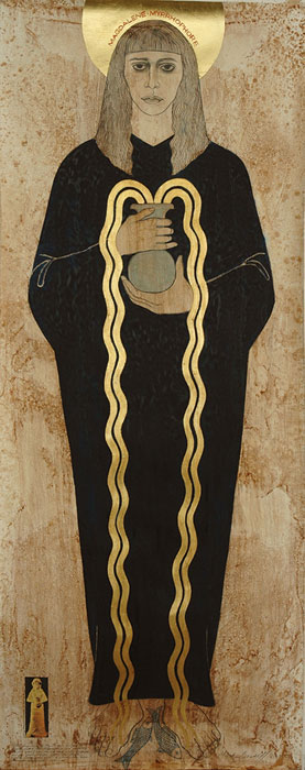 Artist:  Majak Bredell Title:  MARY MAGDALENE - MYRRHOPHORE. 2016 (170 x 68cm) Medium: gesso, graphite, oilwash & goldleaf on Fabriano paper Price on Request