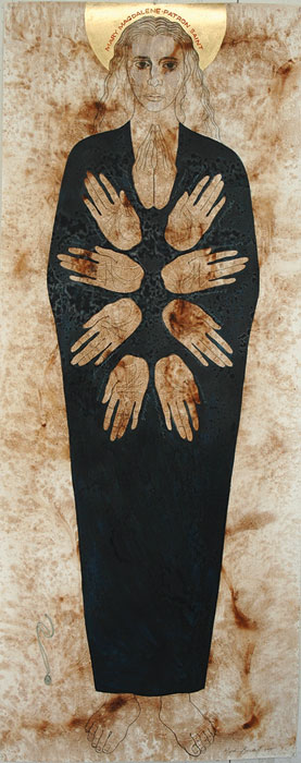 Artist:  Majak Bredell Title:  MARY MAGDALENE - PATRON SAINT. 2016 (170 x 68cm) Medium: gesso, graphite, oilwash & goldleaf on Fabriano paper Price on Request