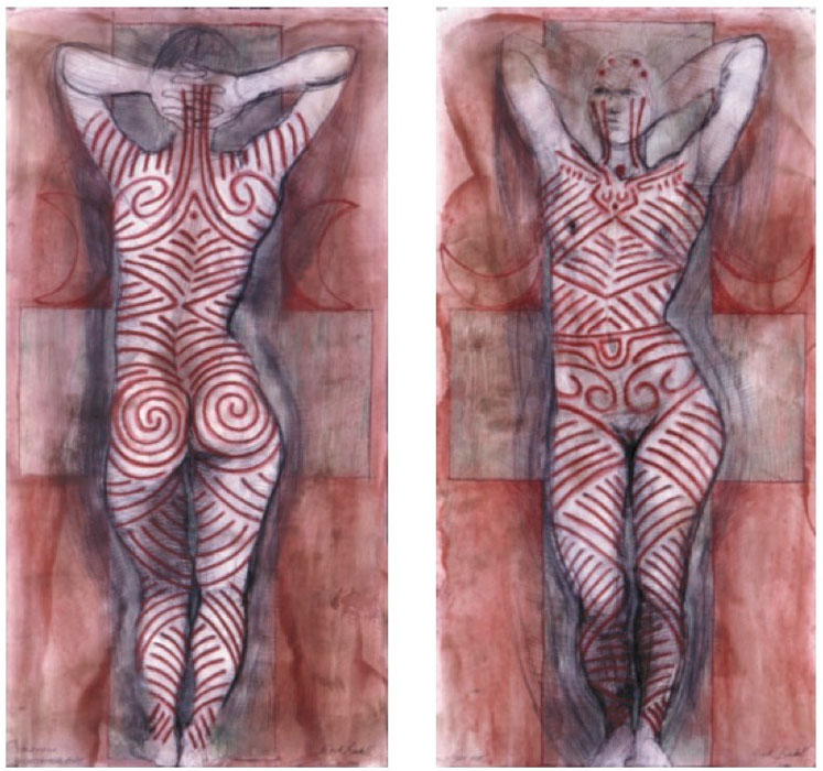 Artist:  Majak Bredell Title:  INSCRIBED BODY 1 & 2. 2001 (127 X 48cm) diptych/framed Medium: gesso, graphite, oilwash & pastel on Stonehenge paper Price on Request