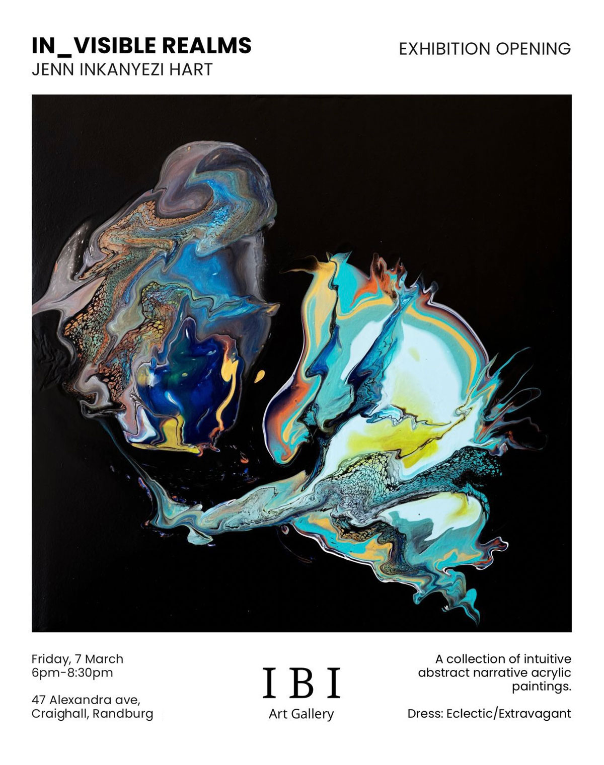 In Jenn’s collection of intuitive abstract narrative acrylic paintings - where the wild, quirky, and fantastical elements of nature take center stage - hidden elements emerge... Opening Reception: Friday, 7 March 2025 | 6:00 for 6:30 PM–8:30 PM Artist Talk: 7:15 PM Venue: 47 Alexandra Ave, Craighall, Randburg Inspired by nature’s unabashed creativity, guests are invited to embrace its spirit — whether through a single eclectic &/ extravagant piece or by making it the theme of their outfit. Think bold patterns, unexpected textures, or a touch of the surreal! For those seeking a quieter, more contemplative viewing experience, the exhibition will also be open on: Saturday, 8 March: 10 AM – 6 PM Sunday, 9 March: 10 AM – 3 PM For more information contact Isa at +27 83 600 4030