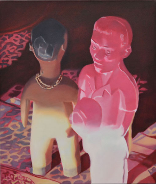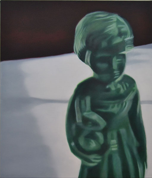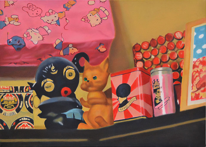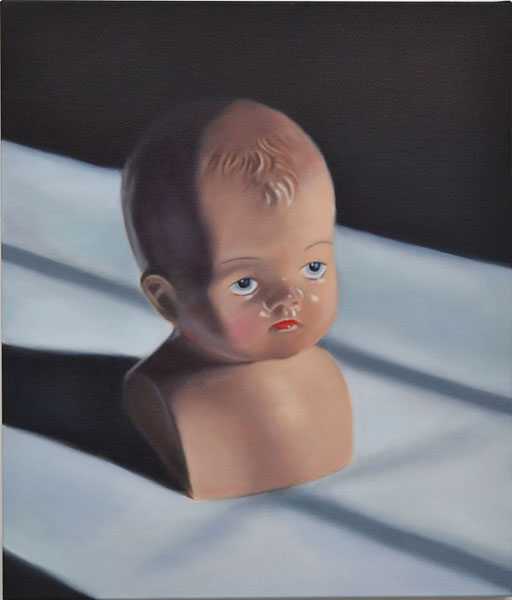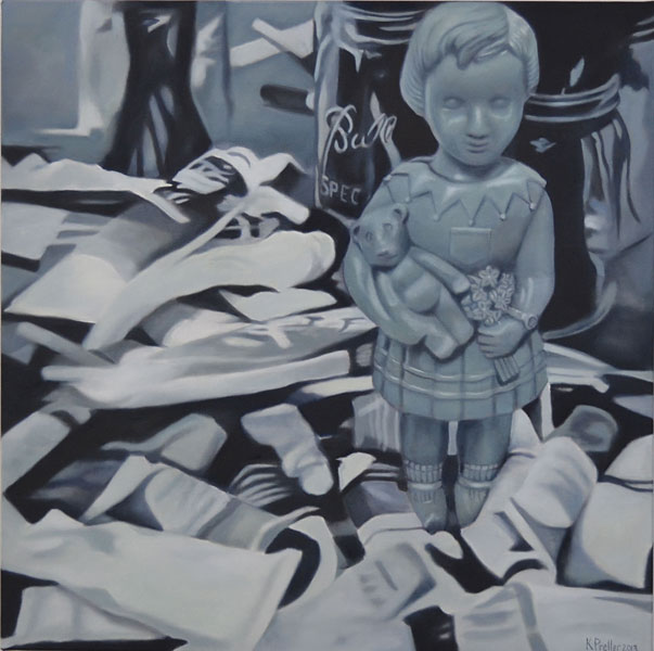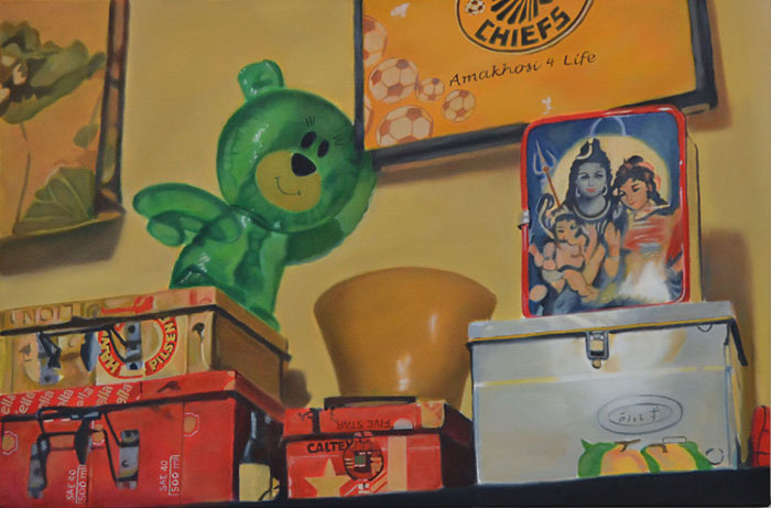 Most of the objects depicted form part of a collection displayed in a friend’s house, others are Preller’s own. Acquired and treasured over time, they become shrines to existence; repositories of memory and obsession, at once eerie and often humorous; testaments to the stories of their owners or those to whom they once belonged. The apparent randomness of collection and display unintentionally strike a web of relationships, the objects becoming carriers of meaning beyond those initially attributed to them, either because of their isolation or because of strange juxtapositions made visible in paint.