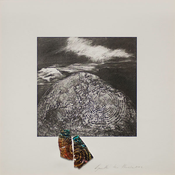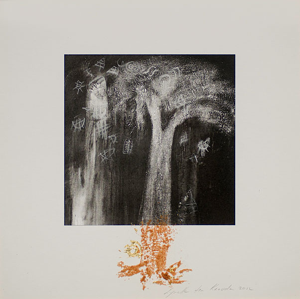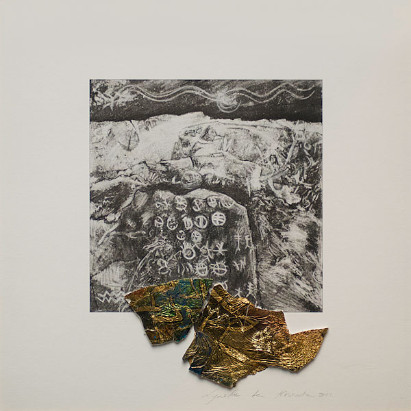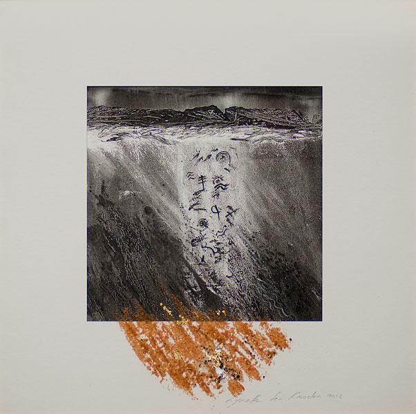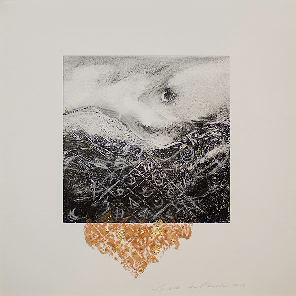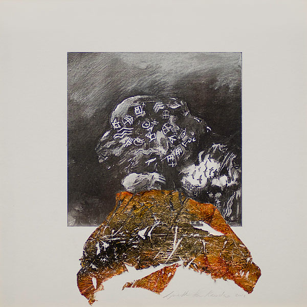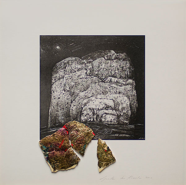 In her works she pursues those themes she explored for the past 30 years. Wide spaces, rock formations and vistas, deserts and night skies sprinkled with millions of stars, the markings left by old civilizations of their rituals and also fossils captured in layers of sediment - all witnesses of by-gone times. She combines her small monotone works with sand from the Kalahari, the Limpopo valley and beaches along our sea coasts, as well as bits of painted ostrich shells, pieces of lost vases and flasks and gold leave fragments.