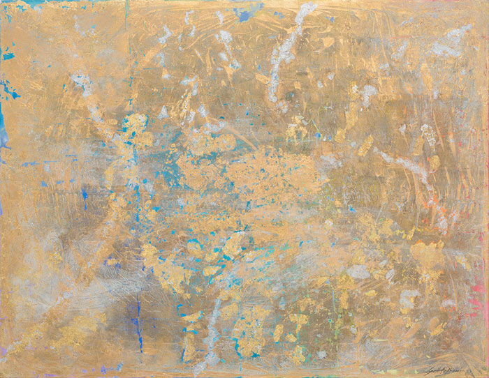 Artist:  Lynette ten Krooden Title:  Iridescent rainbow stone - Where stars were borne Medium: Gold-silverleaf, acrylic and oil on canvas Size:  120 cm x 180 cm