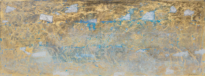 Artist:  Lynette ten Krooden Title:  Where light and water blend Medium: Gold-silverleaf, acrylic and oil on canvas Size:  75 cm x 200 cm