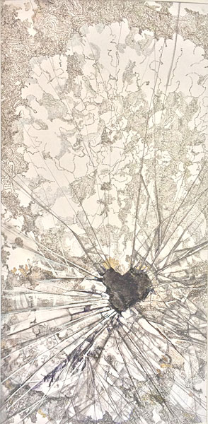 My work for this exhibition combines the Word of God with shattered windshield glass. The horrible beauty of the glass shards obscures the Word in some areas while the Word is clearly visible in others - symbolic of the push-and-pull between faith and fear - a spiritual and psychological battle faced by most of us.