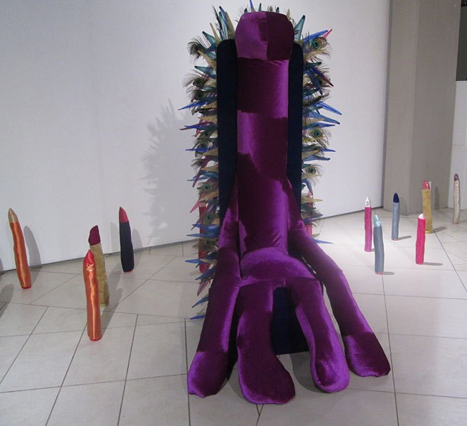 Stephanie Neville is a housewife that is often separated from her work-travelling husband. Her artwork entitled Confessions of a bored housewife shows colourful, handstitched 'fantasy furniture' that is 'meant to be sat on' and a video showing scenes of sexually arousing images. She wanted to encourage women to embrace their sexuality and to experience it without feeling ashamed (it is still frowned upon). The furniture is a metaphor for masturbation -'keeping her idle hands busy.' The upright figures that look like pencils are actually penises. The beanbag can be seen as an explosion of sperm.