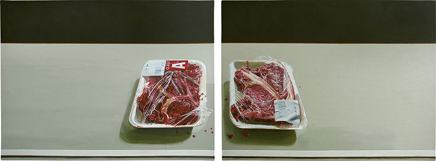 In her studies of baked goods, Nel uses processed confectionery ? and the packaging that encases it ? as a representation of the paradoxical power and vulnerability of female sexuality. Here, glazed frosting and piped cream immediately call to mind female genitalia or breasts, as in Cream Bun (2014) and Two Buns I (2014) respectively. The plastic wrap, while ostensibly serving to preserve its contents, in actuality offers minimal protection against eventual violation. For Nel, this tension speaks to the notion of paradisus amissus, where innocence ? particularly that of the girl child, is irrevocably lost. When considered from the perspective of recent revelations of sexual abuse and harassment within the American political and entertainment arenas, these works take on even greater topical significance. In the process of exploring baked goods as a metaphor for female sexual objectification, degradation and assault, Nel also began investigating how this theme might relate to the aging female in particular. By documenting confectionery before and after the effects of decay set in, Nel not only touches on the modern preoccupation with artificially prolonging and enhancing female sexual desirability, but also the inevitable process of ageing and ultimate rejection of the aged female from society. "Best Before I and II are the result of my investigations. Here, the baked goods are encased in plastic wrap, which serves only as a temporary shield against eventual decomposition. So too the body continues with the process of decay and death,? Nel says. Similarly, Nel's explorations of raw meat serve to extract complex and contradictory responses from the viewer. The most visceral and challenging of the series, the still-bloodied cuts speaks of an earlier, unseen emotional or physical brutality, while the plastic and styrofoam serves to sanitise, commodify and even ritualise this violence. ![]() Margaret Nel, Slab II, 2015, Acrylic on canvas, 200 cm x 75cm (diptych)