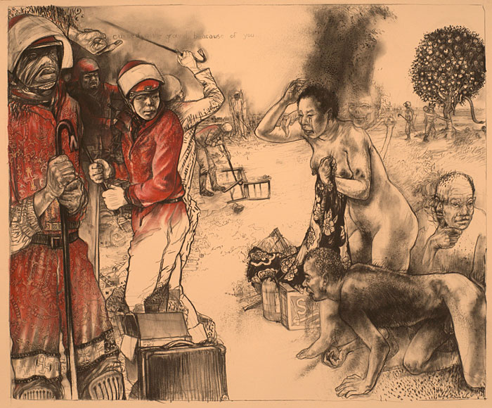 Through our interactions with other people and with society at large, the body serves as a critical site of identity performance. We use or bodies and our sense of identity to convey and project information about ourselves. Feminist philosopher Judith Butler explored the notion of performativity in her analysis of gender development. Butler sees gender as a constructed act through modes of norms and beliefs of the society in which we live, 'scripted by hegemonic social conventions and ideologies' (Felluga, 2006). Butler sees gender not as an expression of an inherent essential quality in us but as performances that one unconsciously adapts in order to 'fit' into society. The exhibition, Performing Wo/Man, curated by Derek Zietsman at the University of Johannesburg Art Gallery explores performativity of gender identity in contemporary South African art and features work by Bambo Sibiya, Bevan de Wet, Christiaan Diedericks, Collin Cole, Daandrey Steyn, Derek Zietsman, Diane Victor, Gordon Froud, Karin Preller, Grace da Costa, Jaco van Schalkwyk, Paul Molete, Richardt Strydom, Tanisha Bhana, Yannis Generalis and more. The exhibition, a first in Zietsman's curatorial career, expands on his Masters dissertation of 2013 in which he focused on performativity of gender with specific reference to the white male identity in post-apartheid South Africa. Zietsman, quoting Butler and Stuart Hall, states that performing gender, as a part of one's identity, is not something that is fixed. Identity is always changing as people adapt and reconceptualize to changing social circumstances. We are always 'becoming' rather than 'being'. Becoming involves continuously adapting to your environment, for example where you live, the people you interact with, the politics of the country you live in, the colour of your skin, the job you do, and so on, all impact on how you perform your gender identity in different social situations. The works selected deal with elements of gender performativity with specific reference to social commentary. Zietsman gathered artists who deal with issues around the historic and contemporary construction of South African identities; masculinity; femininity; patriarchal hegemony; sexual identity; social identity; racial identity; social expectations for post-apartheid gender performativity; political and social change and its effects on gender performativity; rape and violence in South Africa; and abuses of power by role models and politicians. The artists, to varying degrees, reference issues from their personal experiences, or from issues (often around hegemonic exploitation) they may have read and care about to visually explore how these issues affects people's gender performativities. Diane Victor 'Oh my God' Bible stories for misogynist ' Evictions Charcoal, pastel, ash (129 x 151cm) The artworks on display explore a variance of gender performativity issues. Diane Victor's large charcoal, ash and pastel drawings, Acts of God, reference the patriarchal and demanding Christian God depicted in the stories of the Old Testament. In the drawing, Oh my God: Bible stories for misogynist ' Evictions, Victor satirically narrates the eviction of Adam and Eve from Eden but with a contemporary twist. The angels are replaced with 'Red Ants', who evict people from their homes often using heavy-handed tactics. The Old Testament parables are given a new format and assume a biting political commentary on questionable actions in contemporary South Africa. The works of Richardt Strydom and Derek Zietsman also reference a religious theme, but more from the impact of apartheid-era white Afrikaner Calvinist hegemony on the artists. The artists comment on a system where the focus was on the patriarchal white male as head of all aspects in society which, for these artists, resulted in disillusionment with the system. They debunk how they as boys and then as men were 'supposed' to behave and think. Strydom's work is direct in his apparent anger and rebelling against these preconceived hegemonic structuring of what it means to be a white Afrikaner male. The exhibition questions the general role of women and challenge the stereotypical concept of 'women's work', the contrast between what is 'expected' of them to their reconceptualising performativities in contemporary South Africa. Jaco van Schalkwyk's delicately and tenderly structured paintings reference his experiences as a child growing up on the East Rand and reflects on how the women in his community assume labour-intensive performances of responsibility for the benefit of the community. In a similar vein, Bambo Sibiya's work pays homage to his mother who raised him and kept the family together despite gruelling circumstances of alcoholism and poverty. Tanisha Bhana's altered photographs depict the waste of today's consumerist society where she often unearths the derelict sites herself on the outskirts of the urban, dystopian environments of Gauteng ' often featuring sex workers as models in her photographs. Her works on this exhibition can be read as homage to the poor and demoralized women in society, those who are usually ignored.