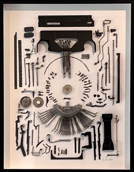 Typewriter parts, board, wood, trace wire, sleeves, plexiglass