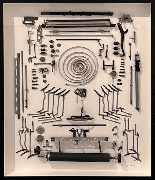 Typewriter parts, board, wood, trace wire, sleeves, plexiglass
