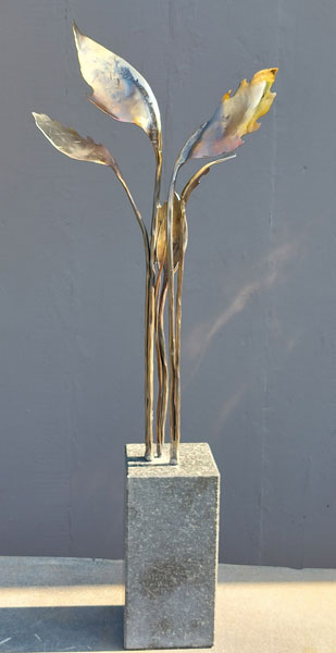 Artist:  Sanna Swart Title:  Sprokkelblaar/Whispering leaves 3 Medium: Stainless Steel and Granite Size:  60 x 15 x 25 cm Price on Request