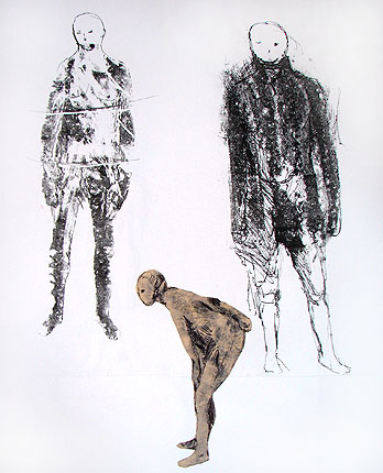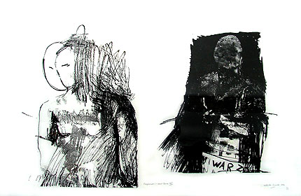While I was making monotypes, I did not neglect the pronto technique and Jill and I began to push the boundaries of that method. Following on my habit of using the photocopied photograph in my sketch books I transferred photocopied images onto the polyester plates and then using the shadow images as a starting point I would add to the figures by drawing directly onto the plates. Jill and I were even able to create small editions from the prontos.