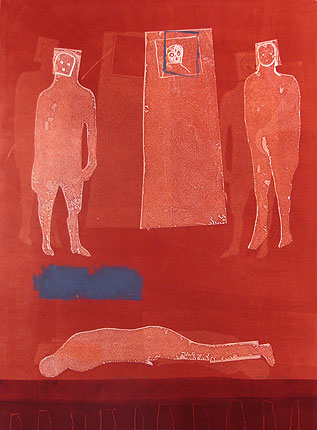 My first prints (apart from a small etching) used the modern method of “prontos” – in effect a lithographic process using a polyester plate. The initial prontos that rolled off the press looked much like the pages of my note books. I decided that I had to push beyond the known and with Jill’s prompting I entered the world of colour by working on a series of monotypes. This was more like it. I was on unfamiliar ground and could embark on a phase of discovery. Stimulated by the monotypes of Colbert Mashile, who was also working at DKW at the time (although not on the same days as me), I shamelessly ‘cribbed’ his palette by using oranges, earth reds and browns.